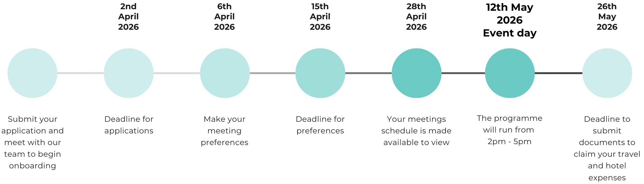 The meetings will be 15 minutes long and held between 11am – 12pm and 2pm – 4pm on the event day (13th May 2025) in the VIP hosted meetings lounge.